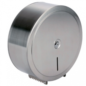 Porta rolos jumbo inox satinado, placa posterior sólida, abertura frontal para fácil acesso, fechadura com chave.